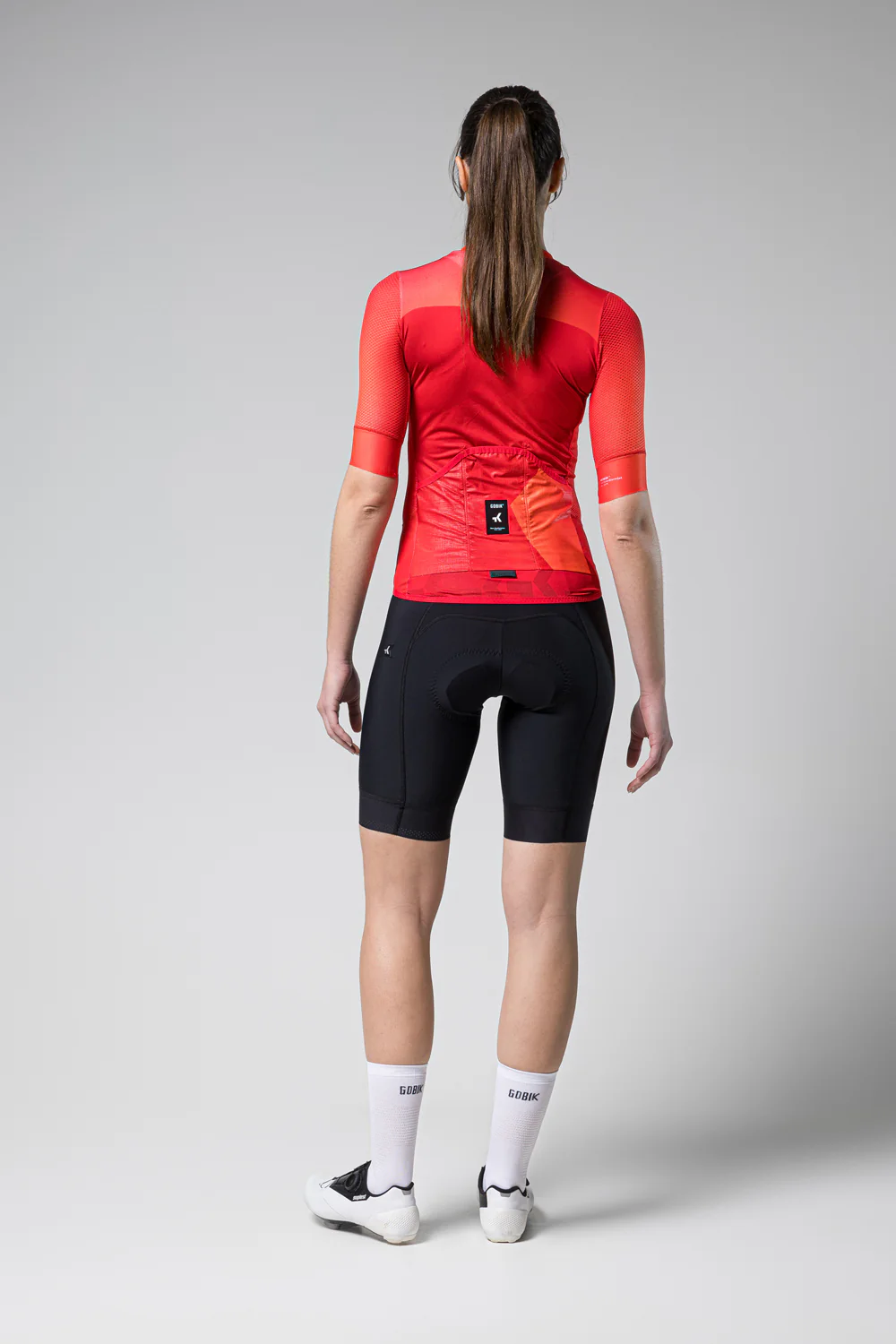 Cinta de las mangas ampliada con forma adaptada a la posición del brazo sobre el manillar, cuando nos colocamos acoplados sobre la bicicleta, mejorando la aerodinámica.