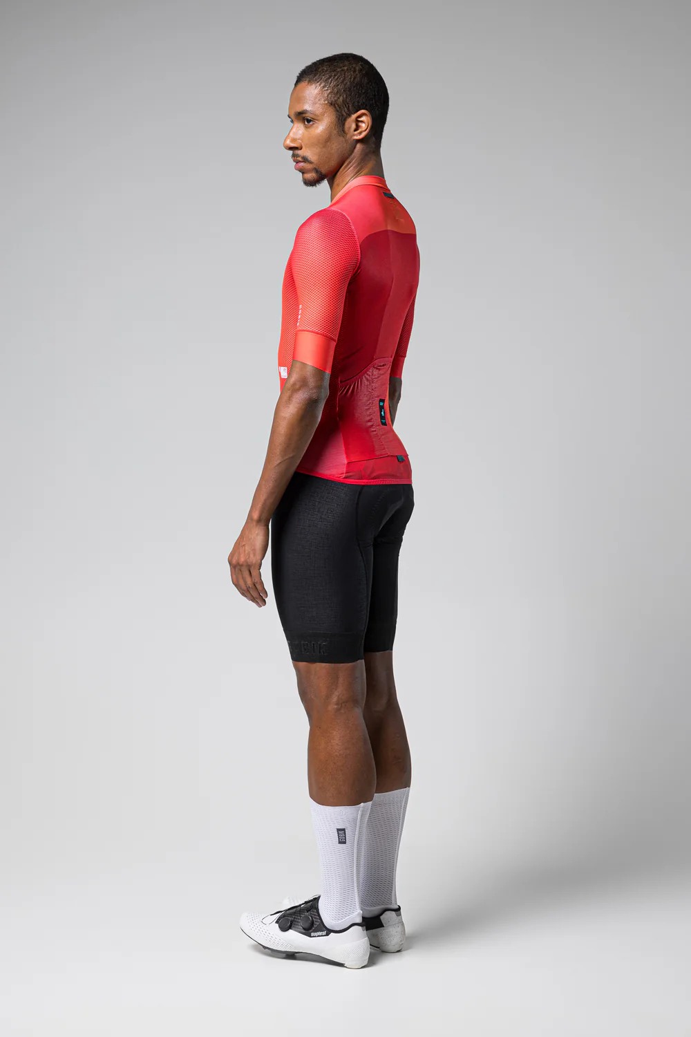 Utiliza una combinación única de tejidos, cosidos a mano, que permite reducir la resistencia aerodinámica en la parte frontal y mangas gracias a su acabado texturizado, mientras se favorece el flujo de aire en la parte trasera, con una terminación lisa microperforada.